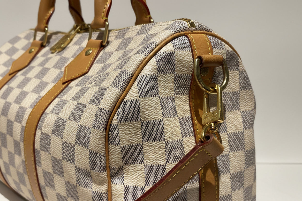 Louis Vuitton Speedy 30 in Damier Azur canvas, a timeless house icon known for its lightweight structure and everyday versatility. Finished with natural leather trim and gold-tone hardware, this classic silhouette transitions effortlessly from daily wear to travel.